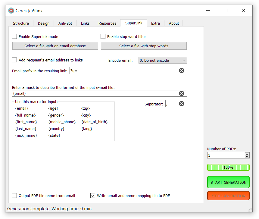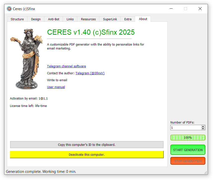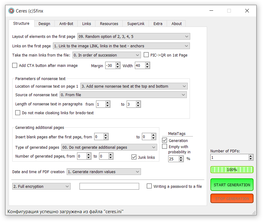 The Ceres generator is designed to create unique PDF files automatically. These PDFs can then be used in white and other color mailings. Mailings can be sent in various ways (email, messengers, social networks, etc.). It combines the maximum possible randomization capabilities (to confuse email and messenger analyzers and increase your inbox) and personalization of your offer to the recipient (to increase the trust of the end recipient and generate mailing statistics on your TDS) based on a preloaded database with email addresses and 13 additional fields. By the way, personalization in PDF text can also have a positive effect on the inbox in theory. The program has many customizable parameters that affect both the appearance and structure of the PDF files created.