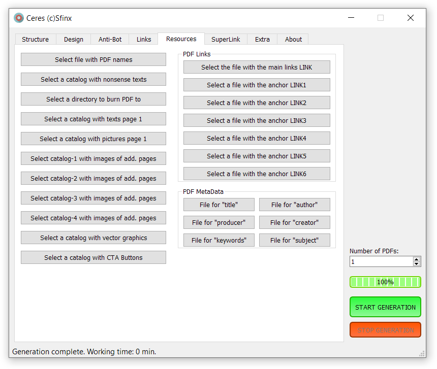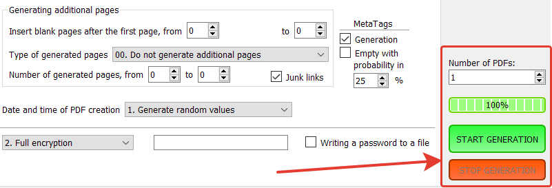- Generation of six fields in the META tags of PDF files (from the corresponding separate files). Can be used both for uniqueness and for “white” work with these parameters and their subsequent use for their intended purpose (see below). Two modes of operation – generation based on data from files (the result is a kind of meaningfulness 🙂 and randomly from Latin characters (for 4 meta tags, the remaining two must be generated from real parameters for authenticity).