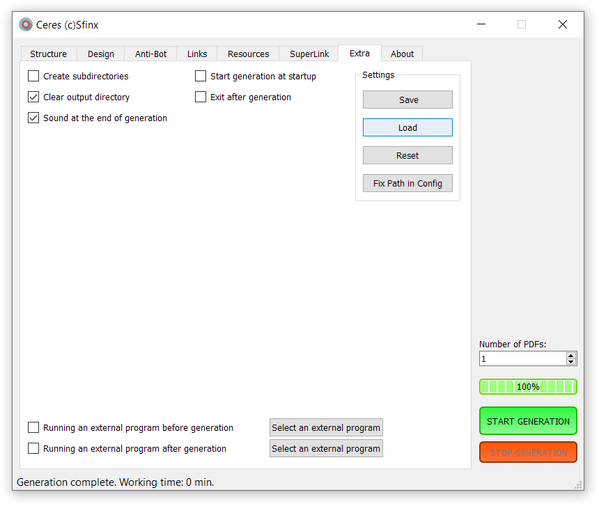 To disable automatic exit after PDF generation, uncheck the “Exit after generation” checkbox on the Extra tab BEFORE the generation process completes. Alternatively, you can reset the configuration in two ways: 1) by clicking the reset button in the interface, or 2) by deleting the ‘ceres.ini’ configuration file. A new one with default settings will be created upon startup.