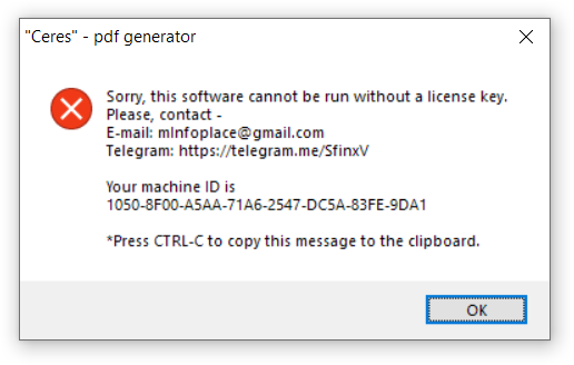 You will then receive a key file for the PDF generator named “cereskey.dat.” Place this file in the program directory and do not delete it afterwards! Re-launch the program. A window will appear informing you of successful registration. The generator will then launch.