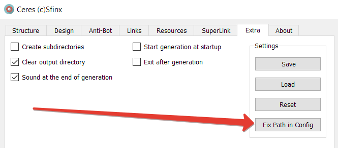 - Incorrect paths in the “ceres.ini” configuration file. This occurred after moving the program directory from another location. To fix this, click the “Fix Path in Config” button located in the “Settings” section of the “Extra” tab.