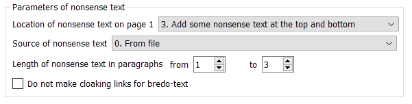 - There is an option to add additional masking “junk” text, known as “nonsense text,” at the top, bottom, or both places at once for the first page. Nonsense text can be taken from files (you can use multiple files) or generated automatically in Latin or Cyrillic layout in a random volume from a specified range of length values.