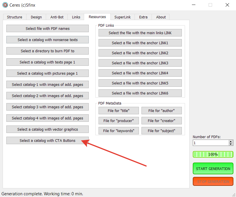 - You can add a single link to the entire first page or separate links to individual page elements (to an image, anchor text, or just in the text). You can also disable the single link and the link from the image (links in the text will remain) to create PDFs that do not require clicking on the link and require a different target action. In the text, you can separately specify all 7 available link types using anchor macros, two of which can be used as sources of additional random text or pre-generated line-by-line numbers and codes.