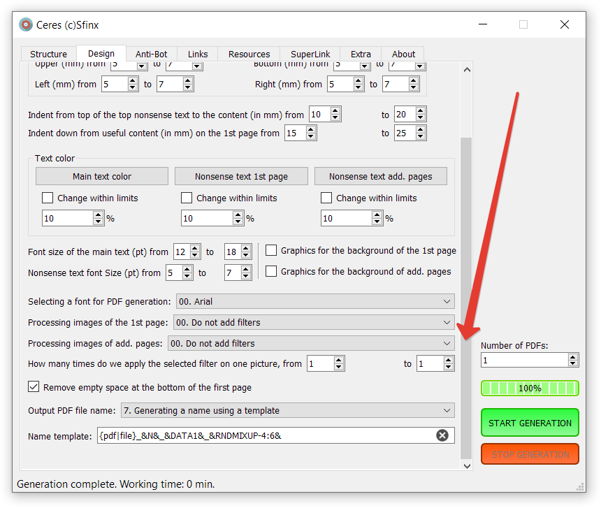 - The ability to select colors for the main text, the gibberish text on the first page, and the gibberish text on additional pages separately. With the option to change the color in each file within a specified range.