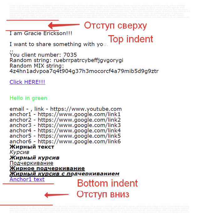 &&&text&&&. If this macro is not present, the input text is processed by the HTML parser by default. In plain text mode, you do not need to force line breaks with the <br> code or wrap the text in the paragraph tag <p></p>. Text font formatting, hyperlink insertion (link masking with text), and other HTML attributes will become unavailable. - For mailing to bourgeois and RU, the generator already has ready-made sets of female and male names and surnames, which are available from file macros.